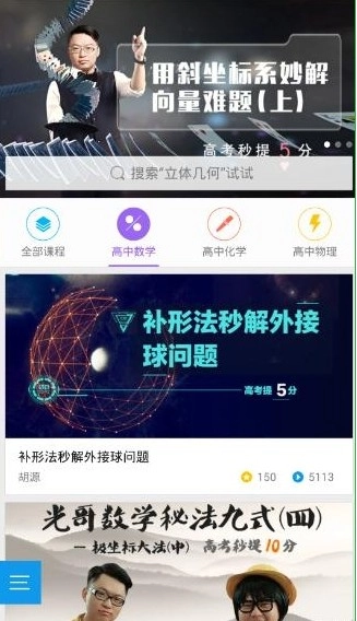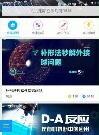 1、打开乐学高考后,打开这款软件,在首页的全部课程栏目,您可以看到高中数学、高中化学、高中物理的高考考点的视频,精准预知高考考点,由知名导师讲解更高效简洁的解题思路,最多可将做题速度提升4倍。