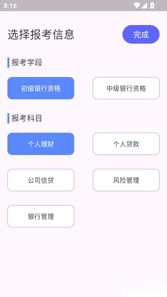 2.之后选择报考学段和报考科目后,点击“完成”进入下一步