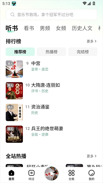 【品类丰富多样】都市霸总文、现代言情与古代言情、玄幻武侠作品、相声评书节目、历史出版书籍有声版、亲子情感类内容等,各类品类任你畅听。