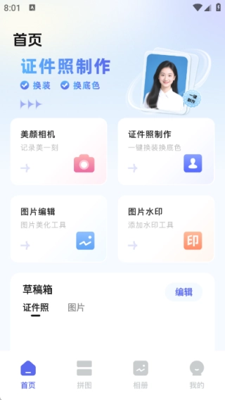 1、在首页中提供了美颜相机、证件照制作、图片编辑、图片水印等功能;