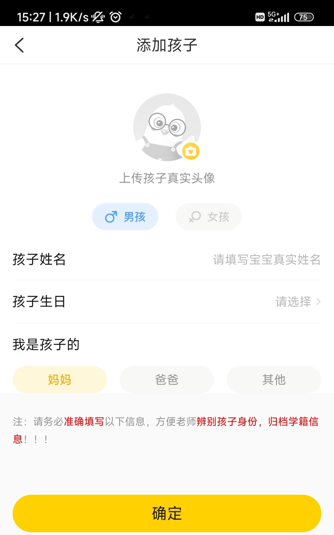 2. 填入孩子姓名、生日以及您和孩子的关系,随后点击【确定】。
