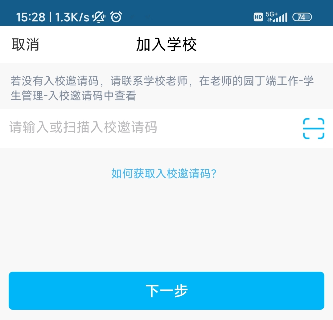 4、输入入校邀请码或者进行扫描,接着点击【下一步】。待进入加入学校的界面,选择年级、班级等相关信息,最后点击【确认加入】选项就完成操作了。