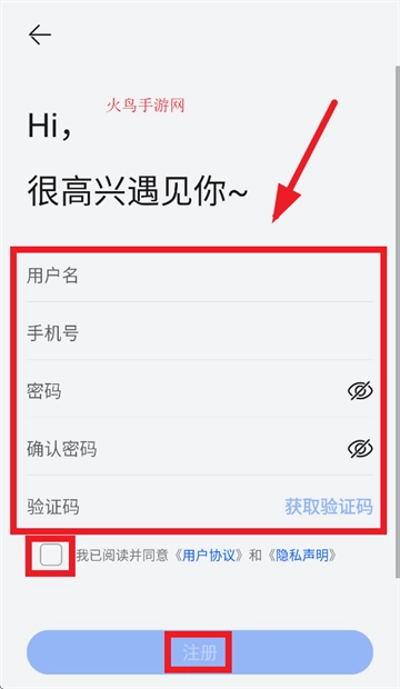 请依次输入用户名、手机号、密码及验证码,随后勾选“我已阅读并同意《用户协议》和《隐私声明》”,最后点击“注册”按钮,便可完成注册操作。