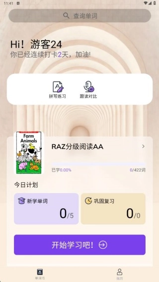 4、点击开始学习功能,就可以了解今日需要记忆单词,对应词义也有。