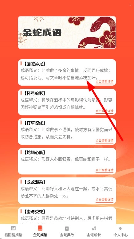 2、在金蛇成语列表中,找到画蛇添足条目,点击其右侧的点击查看详情。