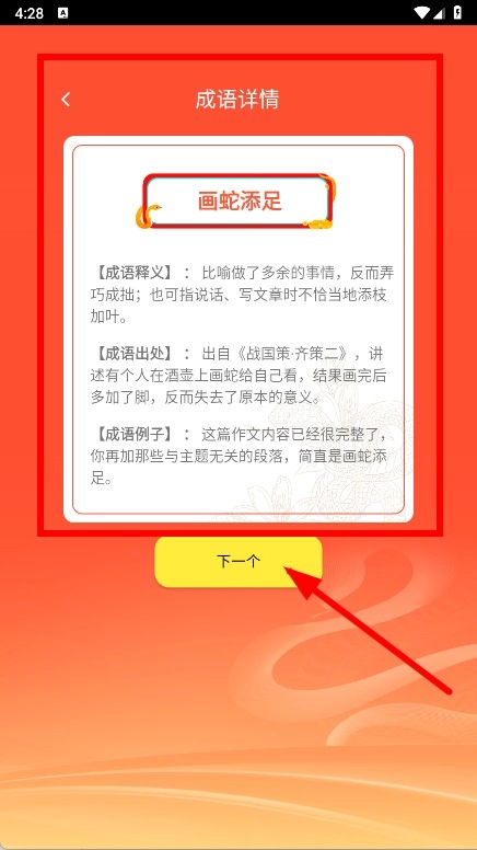 3、查看画蛇添足的成语释义等内容,若需继续学习其他成语,点击下一个按钮即可。