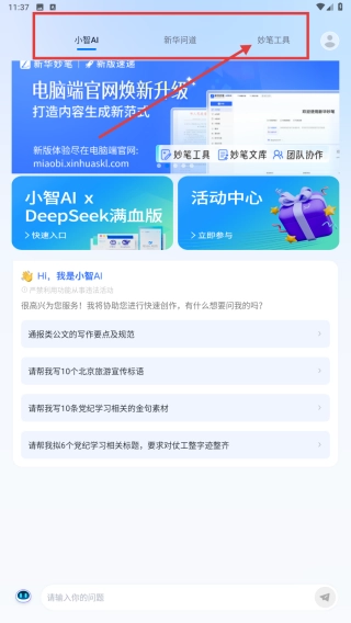 1. 打开小智AI界面,轻点顶部的妙笔工具,跳转至工具集合页面,去探寻写作辅助功能。