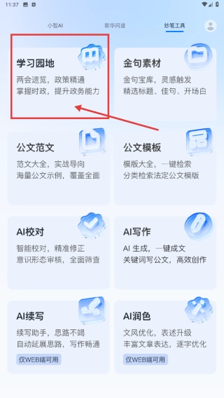 2. 在妙笔工具页面,选中学习园地,利用此工具进行政策解读的学习,同时获取素材与思路。