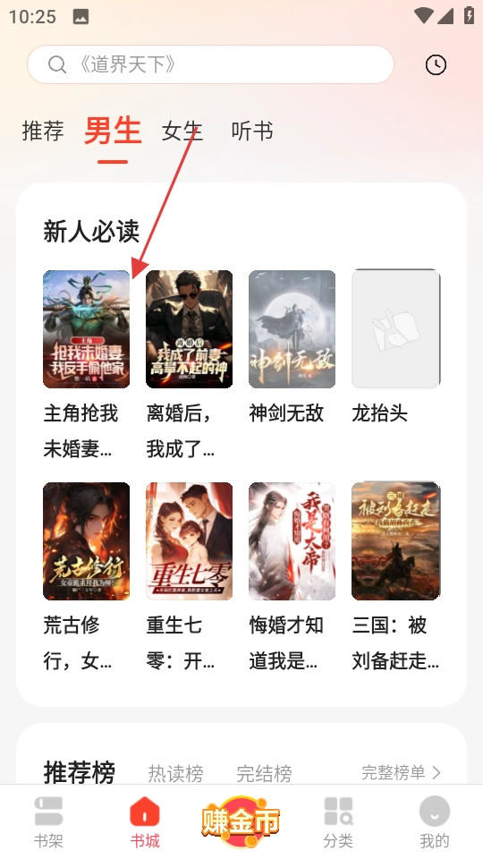 1. 于书城男生栏目的新人必读区域,挑选书籍并进入阅读页面。