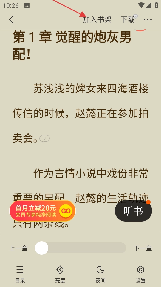 3、点击屏幕,出现加入书架,将喜欢的书籍保存以便续读。