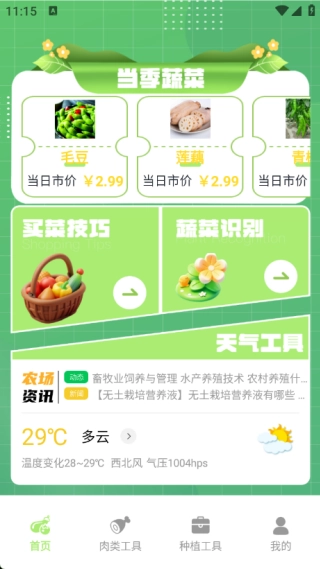 1. 首页设有当季蔬菜价格展示,同时还提供买菜技巧、蔬菜识别以及天气工具等服务。