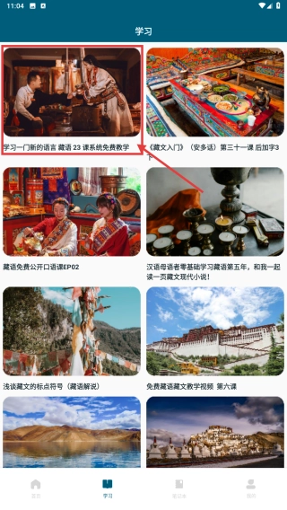 1、打开藏汉互译,点击底部学习选项,进入学习页面。