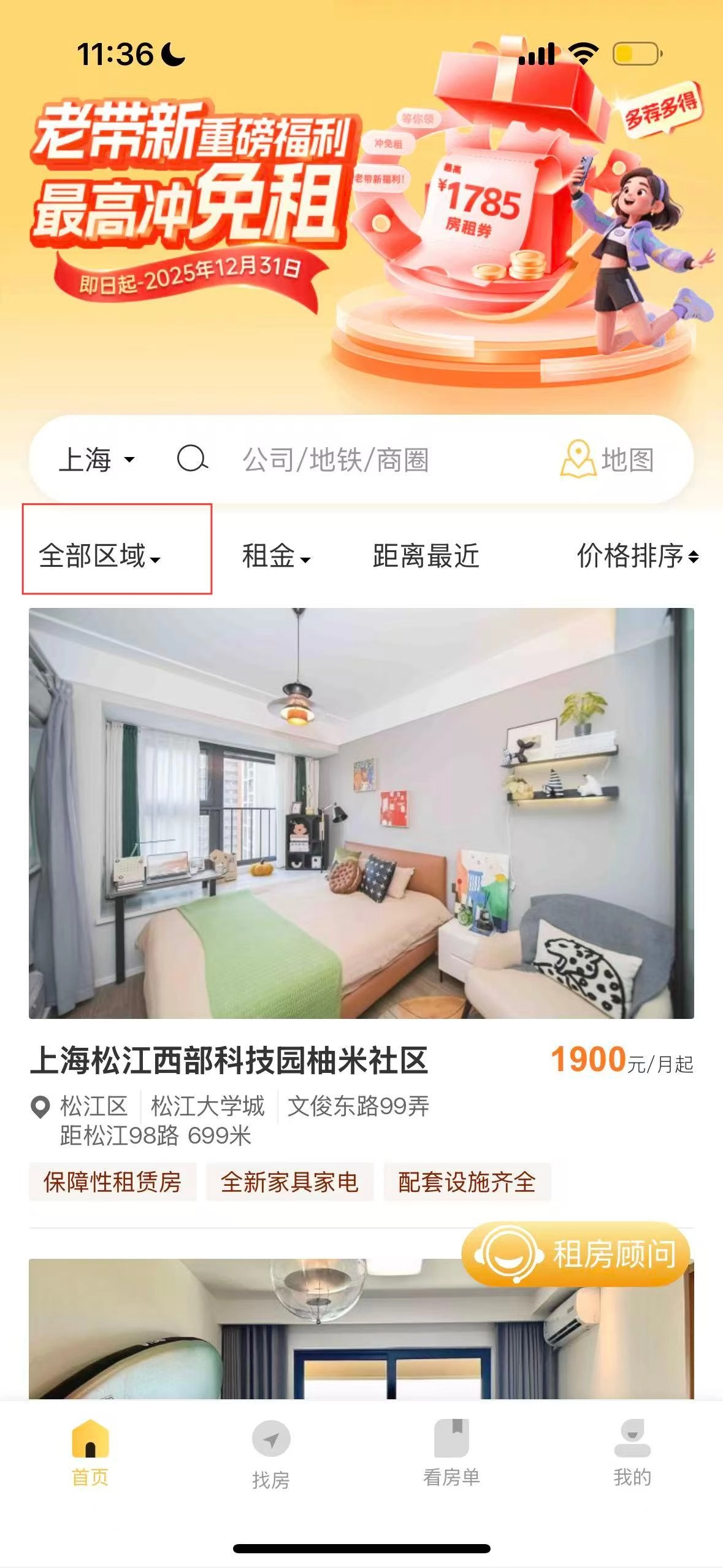 3、回到首页,即可查看所选区域的租房房源,即可点进去租房。