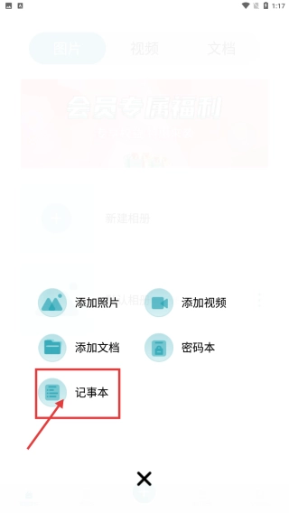 2、在功能选择菜单中,点击记事本选项,进入新建记事本页面。