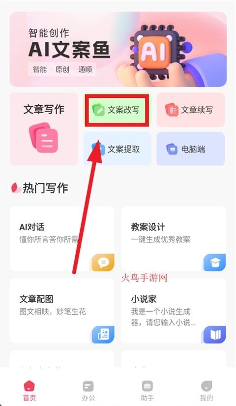 开启AI文案鱼,进入首页界面后,轻点文案改写选项。