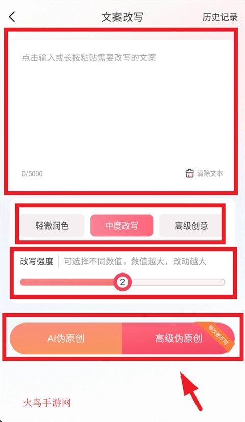 当你进入文案改写界面,既可以直接输入需要改写的文案,也能通过长按粘贴的方式导入。接着,明确自己的改写需求,最后点击AI伪原创或者高级伪原创选项,就能完成操作。