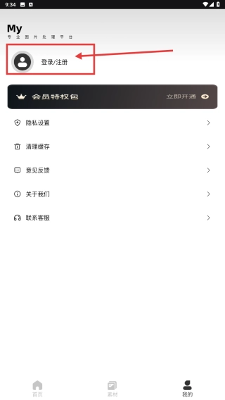 2、在个人中心,点击登录/注册按钮,进入账号登录注册界面。