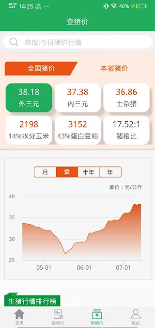 4、软件涵盖全国猪价信息,在首页呈现外三元、内三元以及土杂猪等品种的猪价状况。