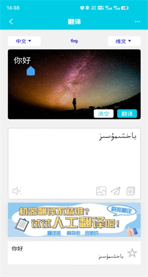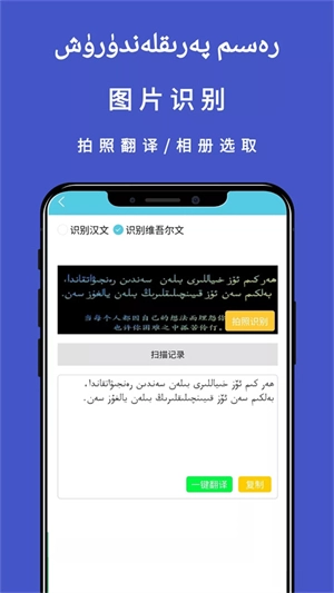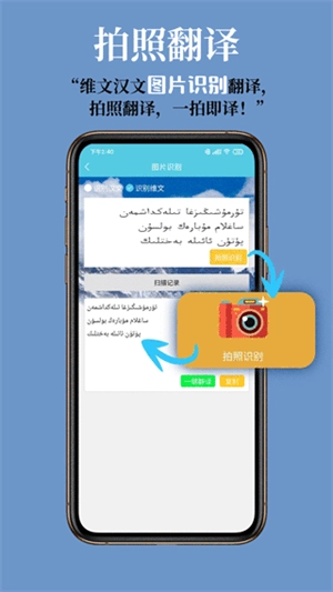 3、拍照翻译:使用高精度OCR识别技术,拍照即译,支持中维文互相转换。