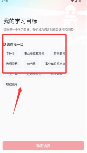 1. 打开软件,首先完成注册。在首页从专升本、职业考试等目标类别中进行选择,之后系统便会自动推荐相关课程与资料。
