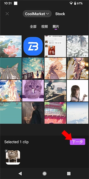 3、打开相册,选择视频或者照片文件,点击“下一步”;