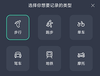 3、可以选择足迹记录的类型,例如步行,跑步,单车,驾车等多种方式,设置好了点击开始即可