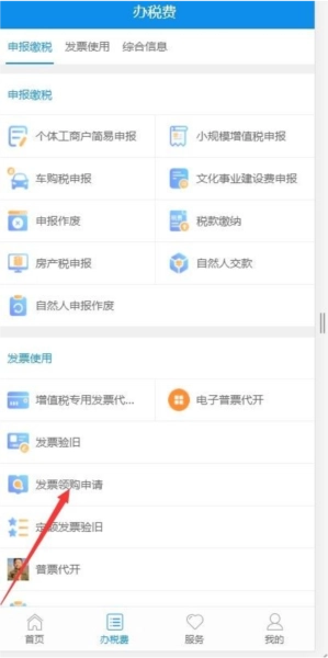 1、登录后,在主页点击办税费,在申报缴税中点击发票使用