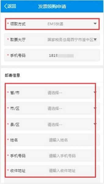 4、填写取方式选择,EMS填写相关邮寄信息