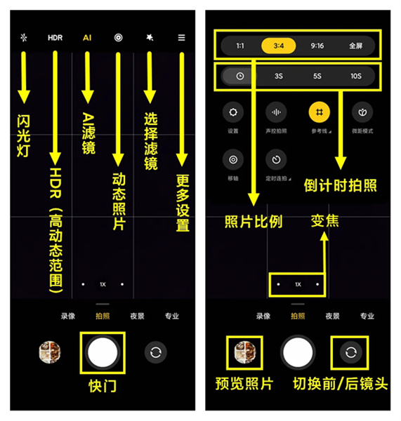 1、顶部四个选项为选择照片的比例,四个选择分别为1:1,3:4,16:9,全屏,这里需要说明的是,3、4选项是全像素尺寸照片,可以最大限度使用传感器的所有像素,其余选项均为在此比例下的裁切效果。