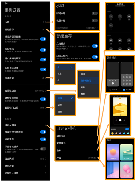 11、自定义相机,这里可以对相机进行自定义,包含以下四个选项:①功能布局,这里可以把所有功能分为常用和不常用;②更多模式,这里有两个选项,可以选择左右滑动,或者上拉显示所有按钮;③色彩,可以在五种颜色中进行选择;④声音,可以在四种相机快门声音中进行选择。