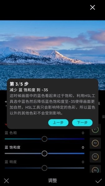 此时画面里的蓝色饱和度显得过高,借助HSL工具选中蓝色,并将其饱和度降低至 -35 ,让画面呈现得更为自然。由于HSL工具仅对特定颜色起作用,因此除蓝色之外的其他颜色不会受到任何影响。