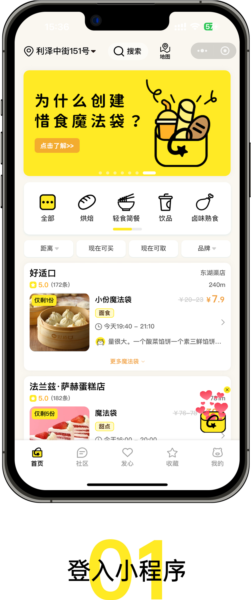 惜食连接本地商家和用户,商家将当天没有及时售出,品质完好的余量食物放入魔法袋,用户预定并获取,“商家+惜食+用户”多方合力拯救本将被浪费的食物。