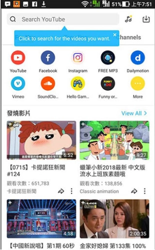 1、进入软件首页,下方会列出支援的网站,可以直接于上方输入关键字,找想要看的影片、听的音乐