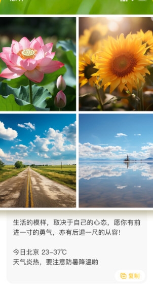 提供提醒服务的同时,每天会为你专属定制打卡图、问候语、节日壁纸等海量素材,可一键可分享至朋友圈、社群,和朋友互道早安,一起变更好。
