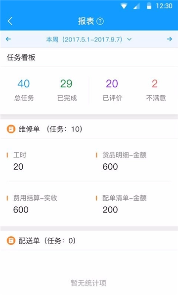 6、报表统计了所有的任务信息,划分了任务看板、维修单以及配送单栏,每一个栏展示详细的分类与内容;