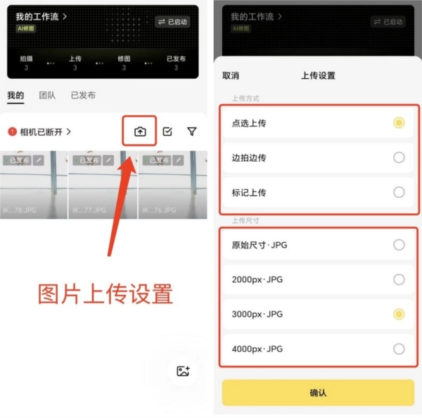 相机拍摄一组图片后,先在相机回放进行图片的标星或加锁,然后连接相机并在上传设置中选择标记上传。