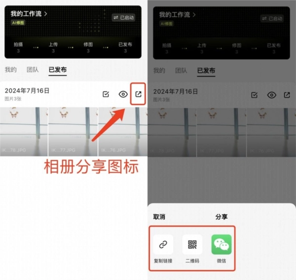 拍摄好照片后,进入已发布页面,点击发布图标,有复制链接、二维码、微信等3种分享方式。