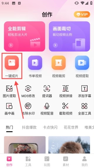 1、打开视频编辑软件进入创作界面,点击【一键成片】按钮开始制作视频。