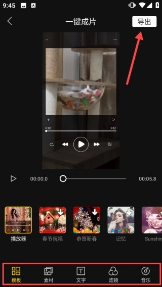 3、进入一键成片编辑界面,挑选适宜的【模板】等开展编辑,编辑结束后点击【导出】来保存视频。