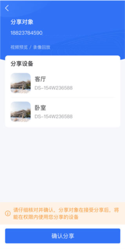 设备视频权限设置:可对“视频预览”(默认必选)、“录像回放”、“报警消息”以及“设备设置”进行选择。若所分享的设备为NVR,那么默认被分享者具备全部权限。