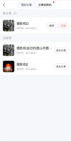 在“我的 - 分享设置 - 分享给我的”列表里,能够看到全部被分享的设备,例如待接收设备,同时支持执行接收或拒绝操作。