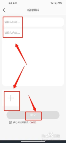 4、进入新闻爆料界面,输入爆料标题、爆料内容、上传图片,点击【提交】。