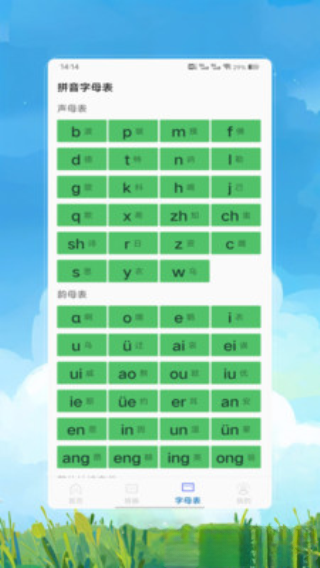 2.具备极为详尽的拼音字母表,轻点任意一个字母表,就能播放该字母的发音音频,同时查看对应的范例词汇。