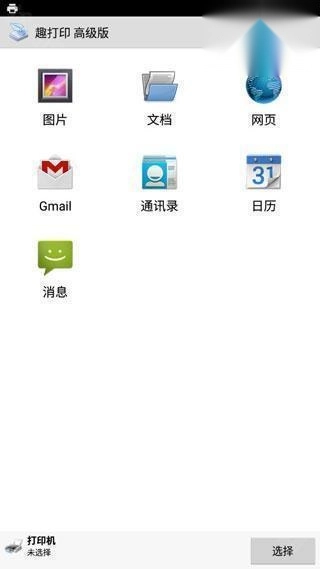 1. 当打印机设备均正常连接完毕,便可点击文件。在主页面上,我们能够选择要打印文件的类型,其包括图片、文档、网页、邮件、通讯录、日历以及短信通话记录。