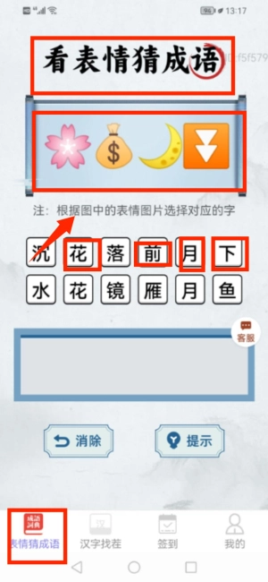 2、选择表情猜成语功能,根据图示选择文字完成成语答题。