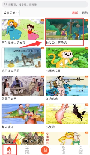 3、进入故事页面找到长发公主历险记,点击进入播放界面。
