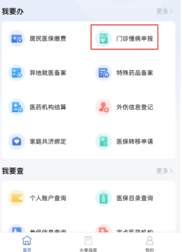 门诊慢病申报:进入首页,我要办下面,点击门诊慢病申报,跳转到微信小程序,填写资料,进行申报