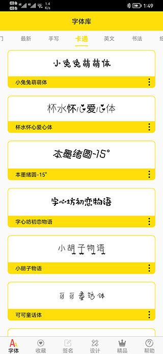 1、字体库里有热门、最新、手写、卡通、英文、书法等。