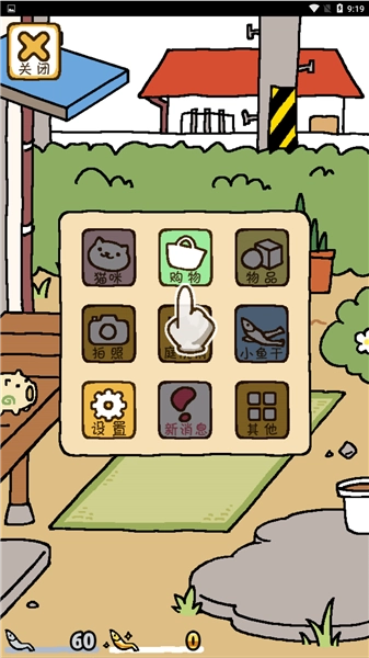 4、包括猫咪、购物、物品、拍照、小鱼干、设置等选项,点击【购物】选项。