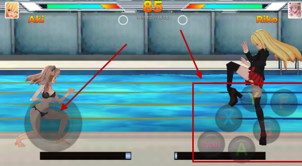 3、然后我们就可以开始格斗了,左侧的摇杆可以控制角色的移动,右侧为各种动作按键。